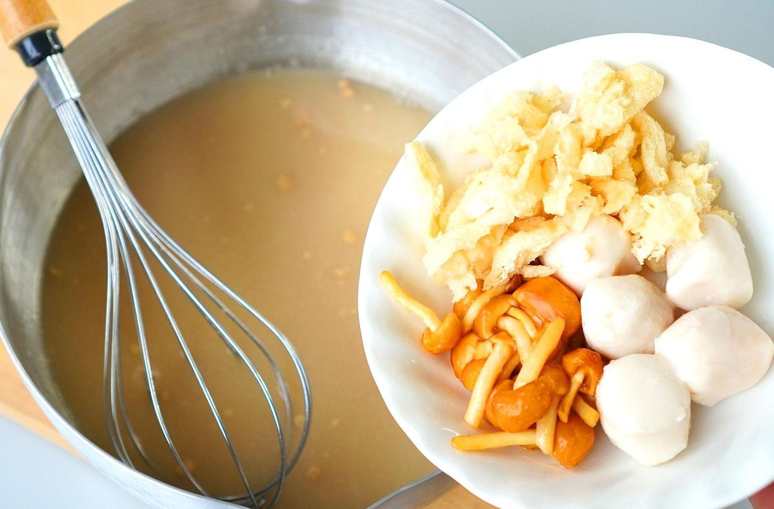 ③納豆粉末が溶けたら、予め水煮された具材や、油あげ、豆腐などを加え、