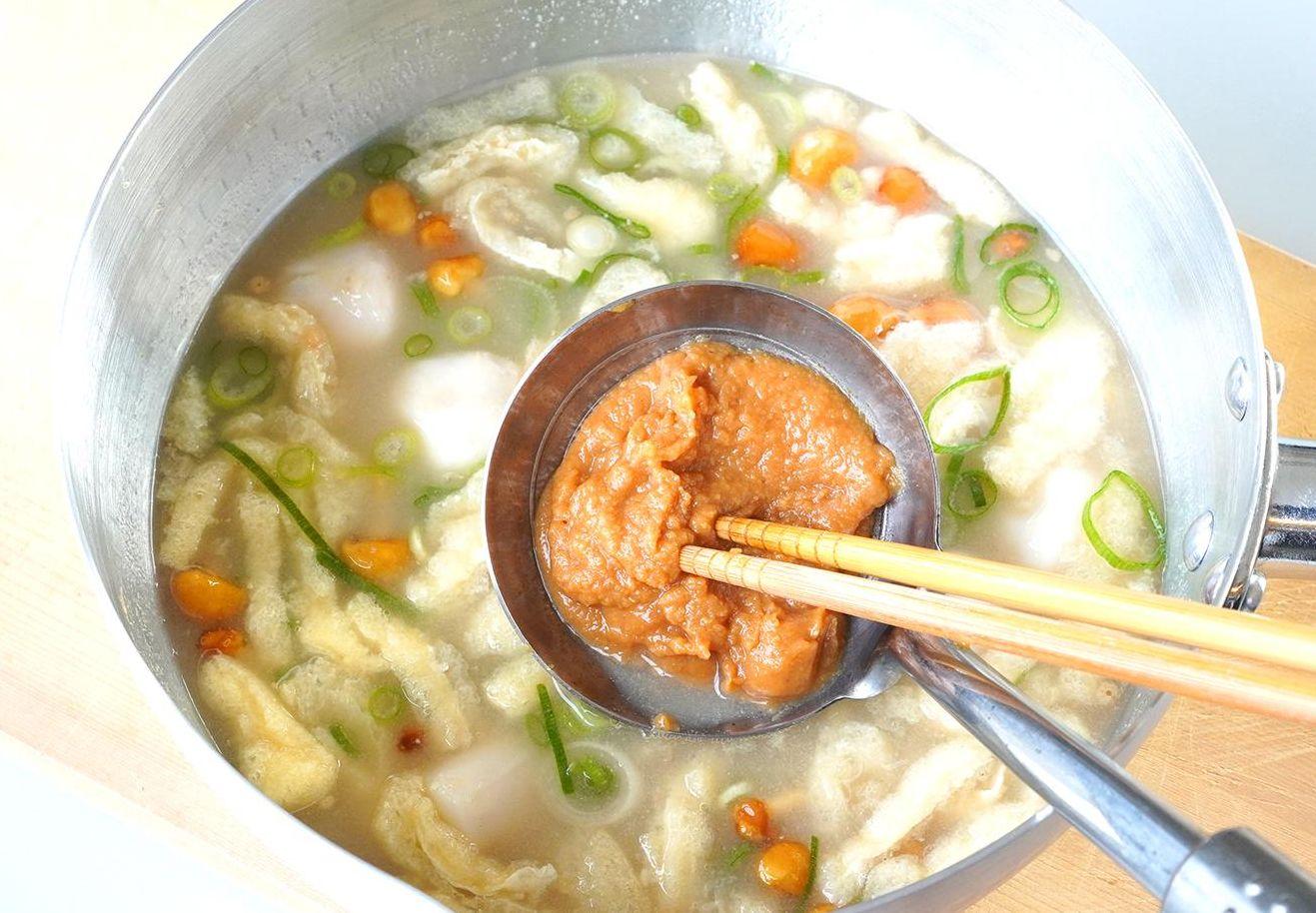 ④具材が温まったら、火を止めて味噌を溶かし入れます。