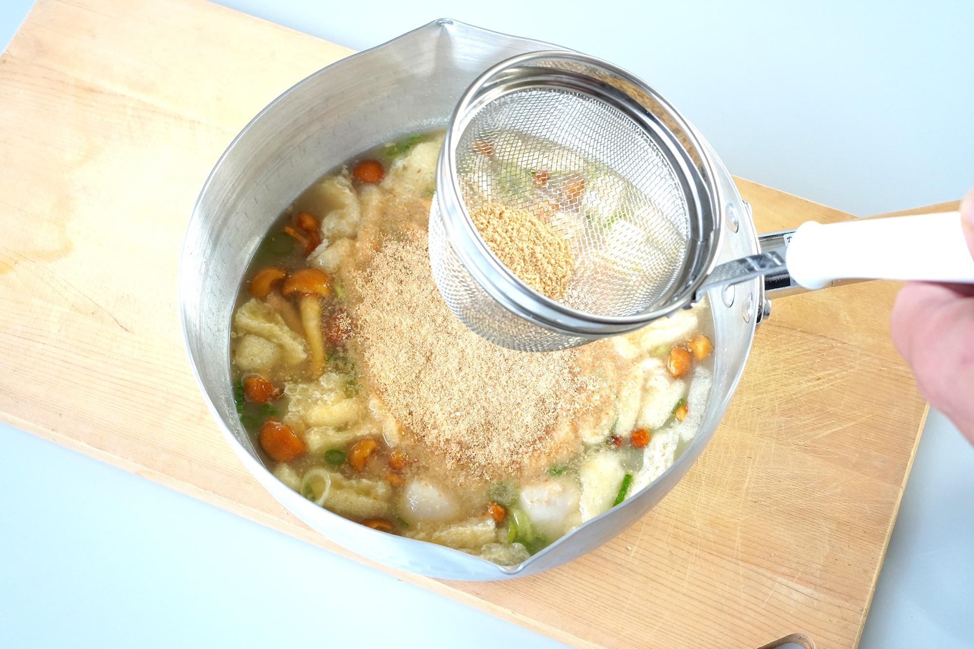 鍋焼きうどんや、温かい蕎麦、ラーメンなど、召し上がる直前にささっと振り入れると、納豆風味をお楽しみいただけます。