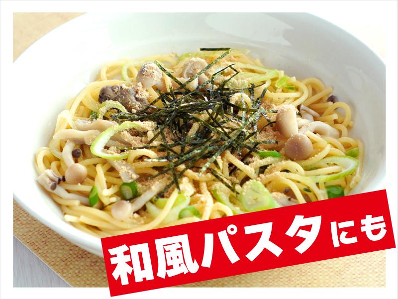 和風パスタにも、粉末納豆を振り入れて召し上がる直前に混ぜ合わせると手軽に納豆パスタに。